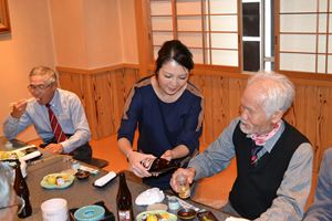 懇親会は、下田会長の挨拶、母校のコーチをしている、野上コーチ、田染コーチから母校の現状の報告があり、関東側のOBの皆さんは母校の現状に認識を新たにし、もっと支援をとの思いを持ったOBもいたのではないでしょうか。有吉氏(S34年卒)の乾杯の音頭で歓談となり、会場になっている秋葉原「三友」の計らいで美味しいふぐ刺し、ふぐちりや美酒を戴きながら、一年ぶりの顔合わせ(中には半世紀ぶりの再会)で会話が弾んだと思います。
