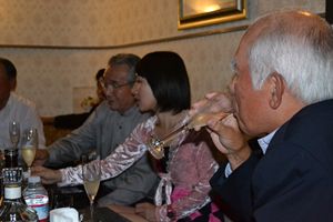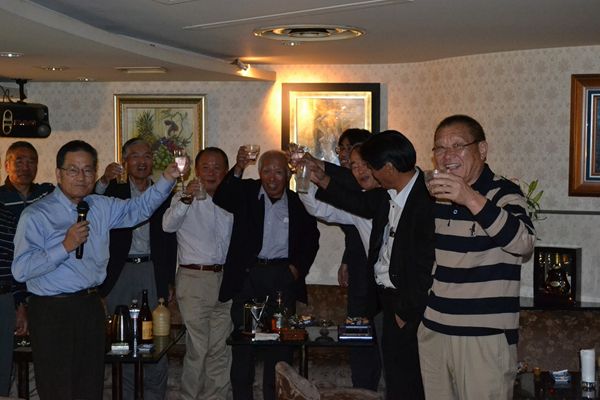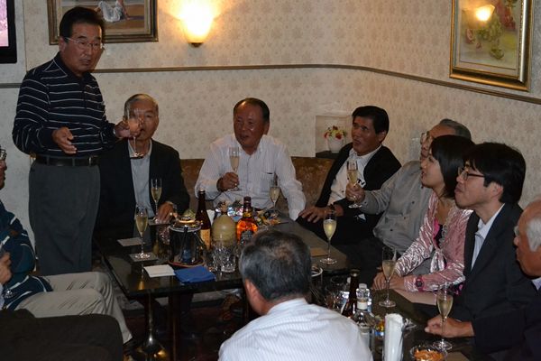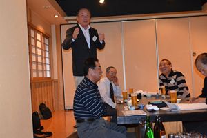 | 乾杯しようやないか まあその前に俺の話を聞け と言ってるかどうかは判りません 左から右へ 坪根英憲さん、山本孝さん、岡崎統さん、 鬼木光明さん、坂田耕一会長、女子、谷口さん、 野見山誠一北辰会関東支部長、廣瀬泰教さん(頭だけ) |