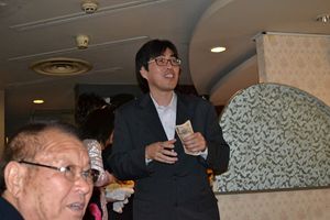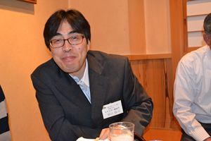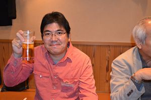 | さあ、呑みまっせ〜 と 高木康祐さん 懇親会の司会・進行をやっていただきました やっと一息ついて さあこれからや〜 右は薬師寺さんか? |