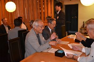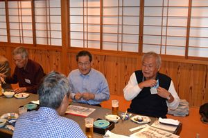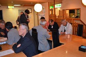 すでに白熱の議論開始? 手前右から反時計回り 久門利治さん、坪根英憲さん、 井上美智男さん 、石橋賢治さん、 (左手前から) 木村武機さん、岡崎統さん(背中だけ)、山本孝さん、鬼木光明さん(頭だけ) |