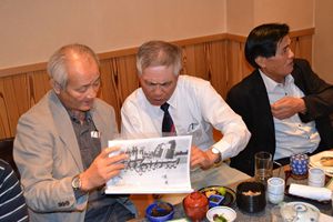 現役時代直接のコンタクトはなかったが3人で話せば繋がりが見える (右から)奥田さん、岡村、井上さん(手前背中)石橋さん |