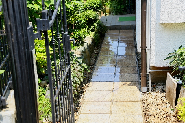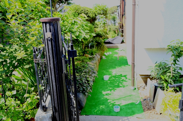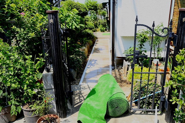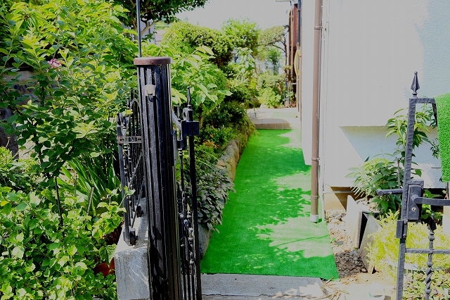 我が家の門扉から玄関に至るエントランス通路に人口芝カーペットを張りました。